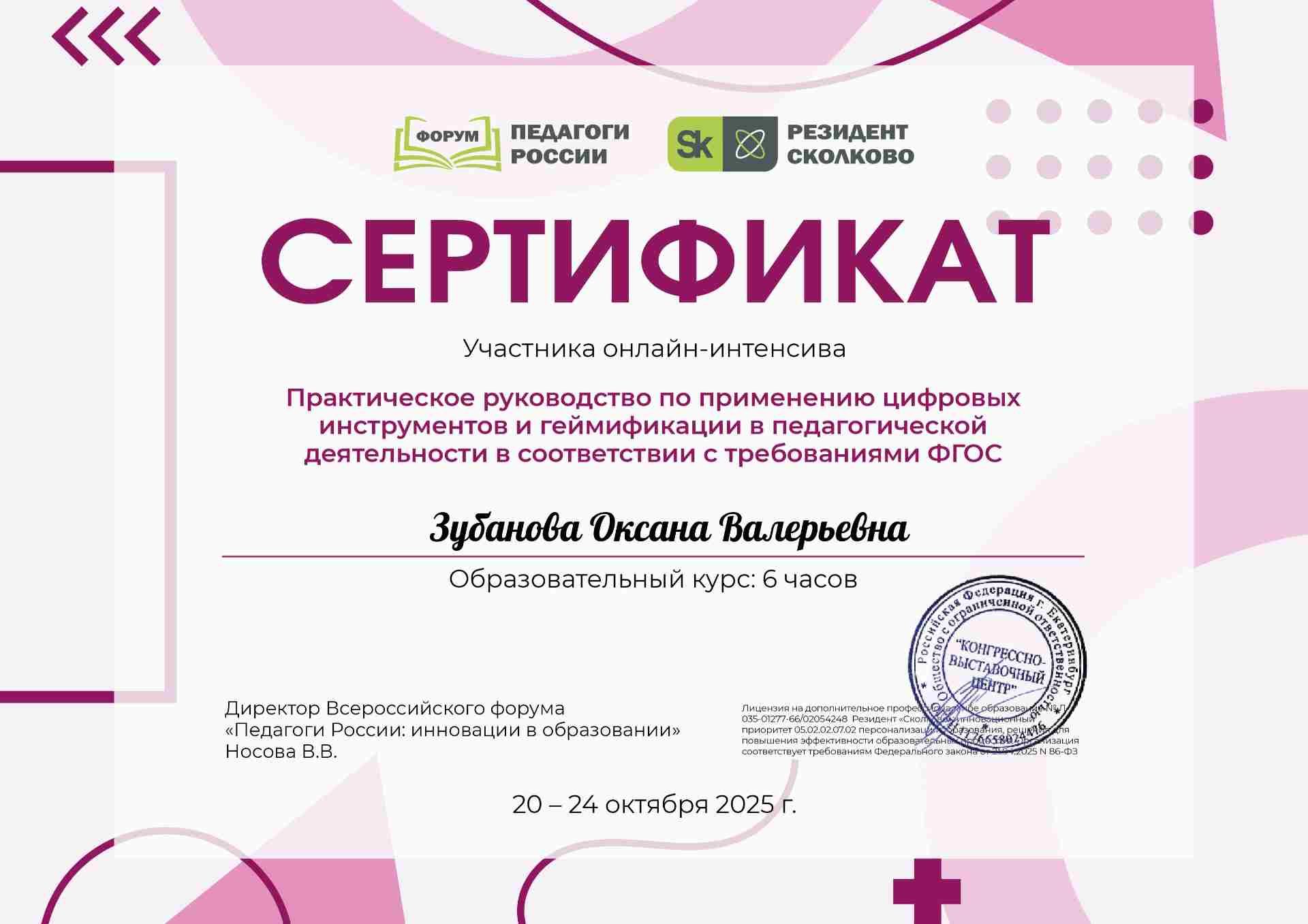Сертификат участника онлайн-интенсива "Практическое руководство по применению цифровых инструментов и геймифика в педагогической деятельности в соответствии с требованиями ФГОС