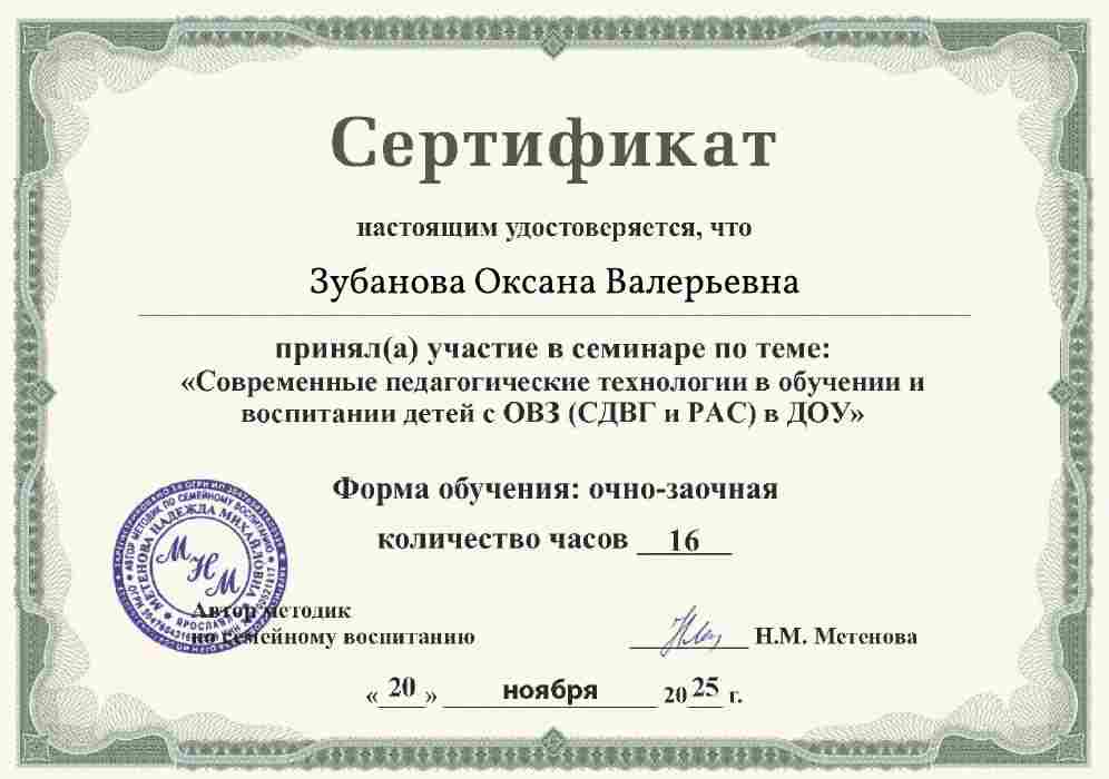 Сертификат участника семинара "Современные педагогические технологии в обучении и воспитании детей с ОВЗ в ДОУ"