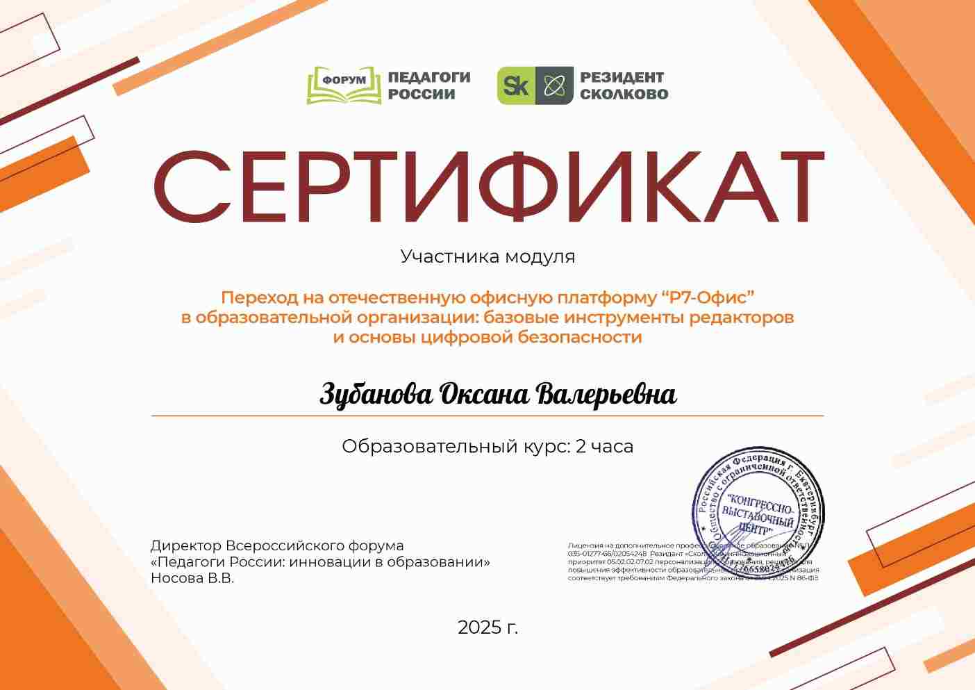Сертификат участника онлайн-форума "Переход на отечественную офисную платформу "Р7-офис" в образовательной организации: базовые инструменты редакторов и основы цифровой безопасности "