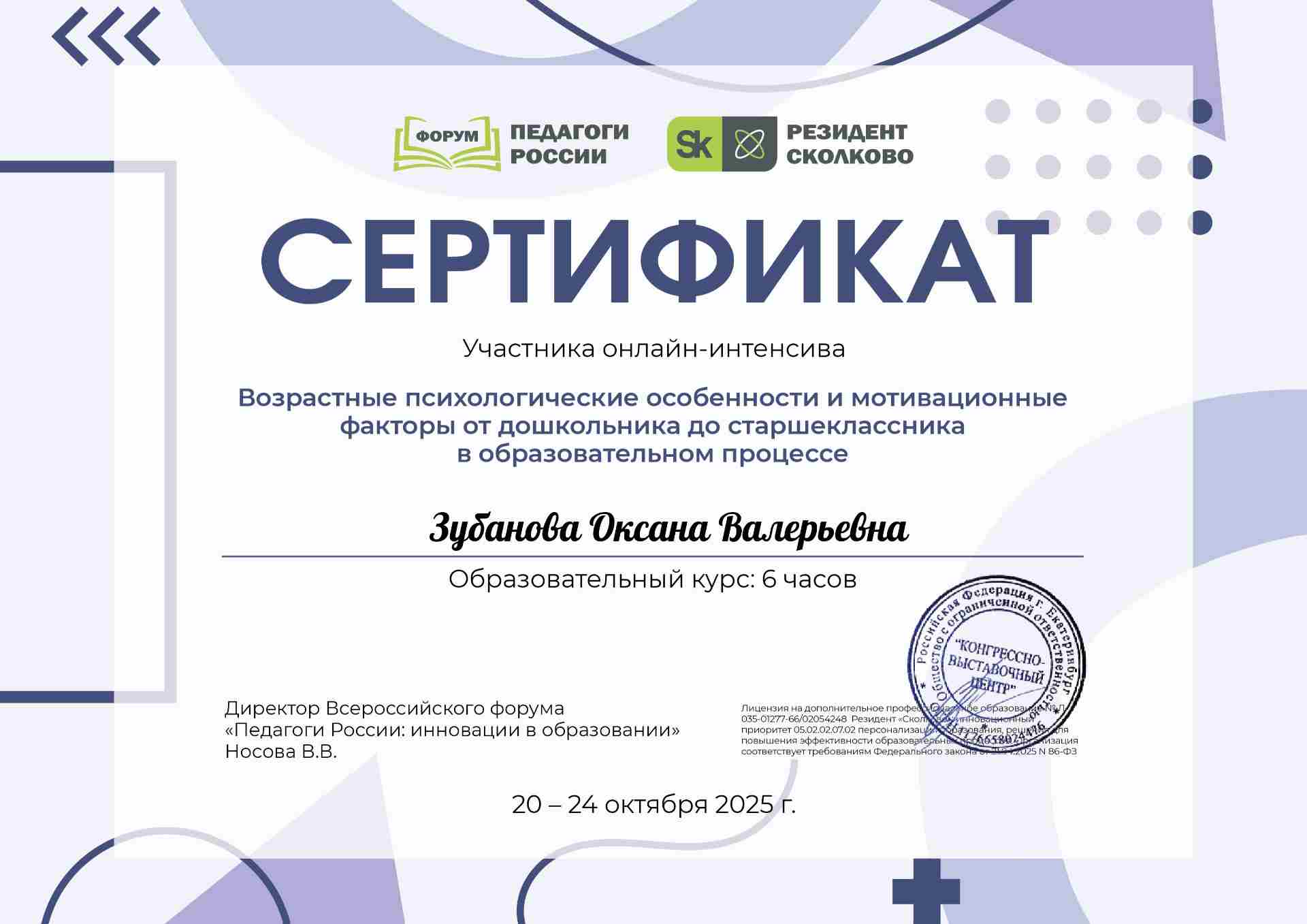 Сертификат участника онлайн-интенсива "Возрастные психологические особенности и мотивационные факторы от дошкольника до старшеклассника в образовательном процессе