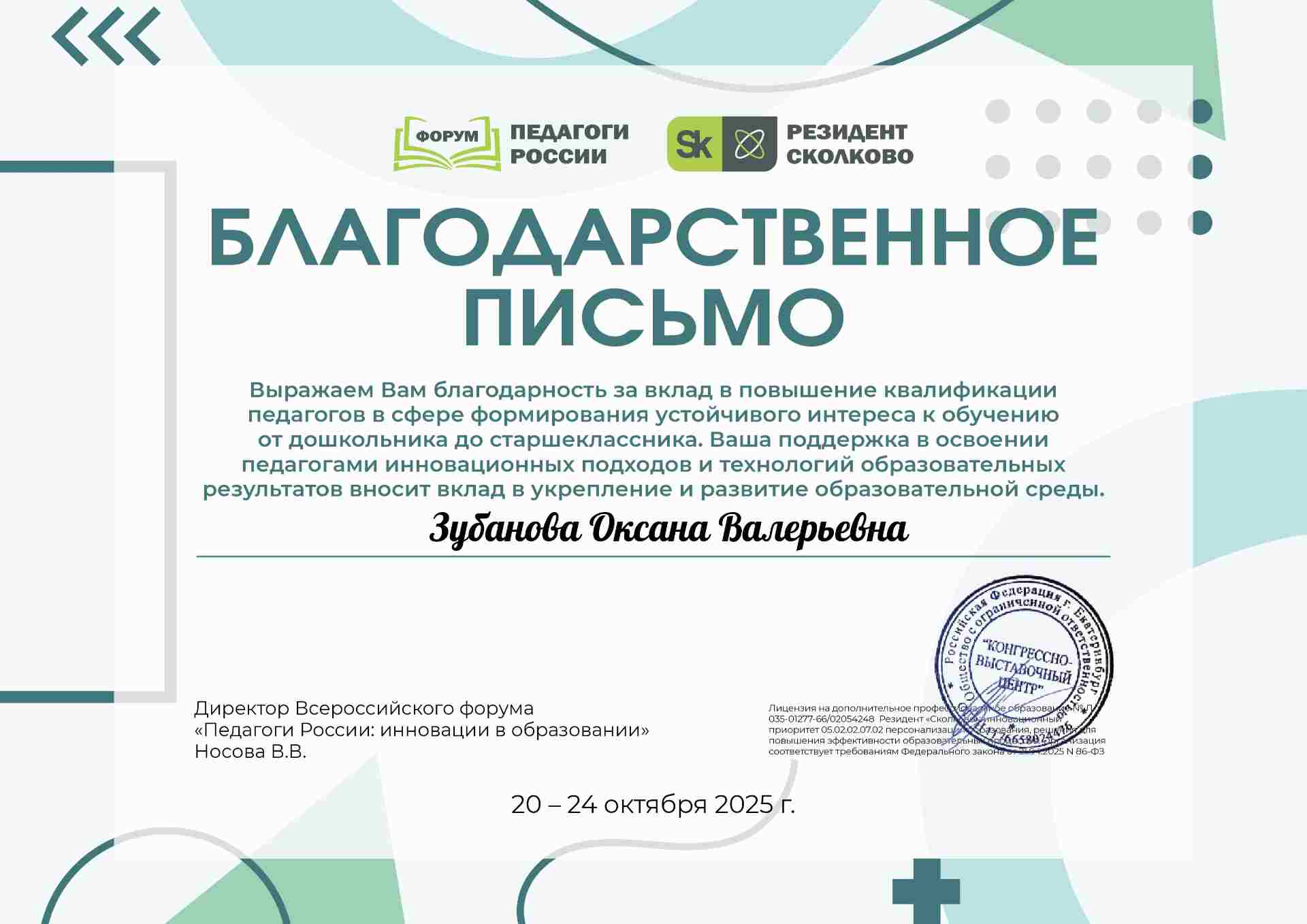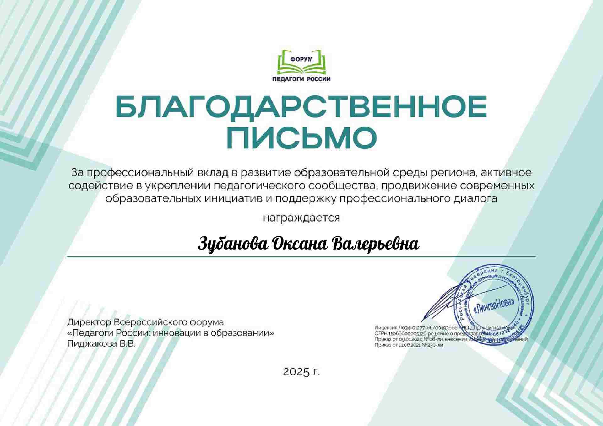Благодарственное письмо за профессиональный вклад в развитие образовательной среды региона, активное содействие в укреплении педагогического сообщества, продвижение современных образовательных инициатив и поддержку профессионального диалога