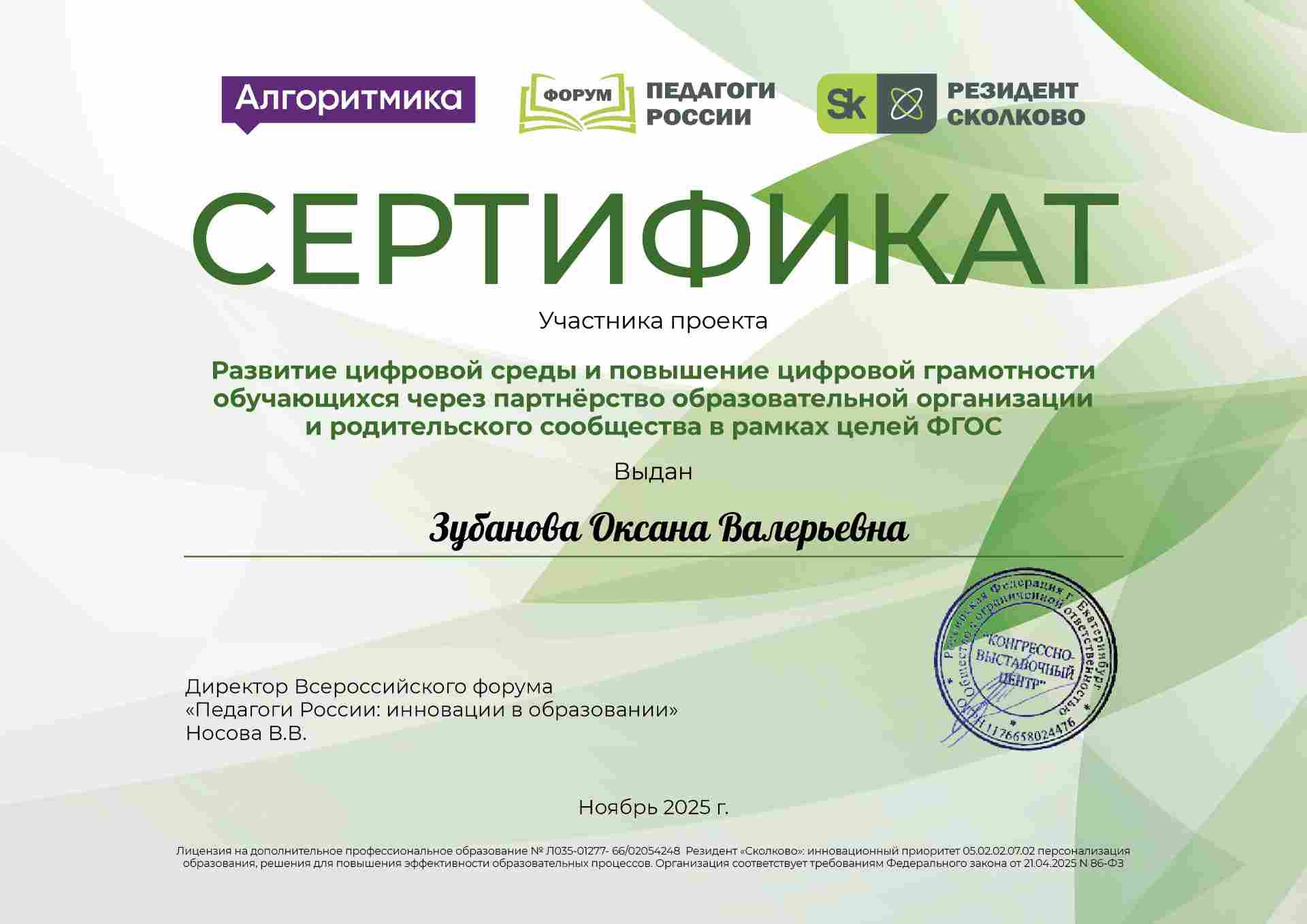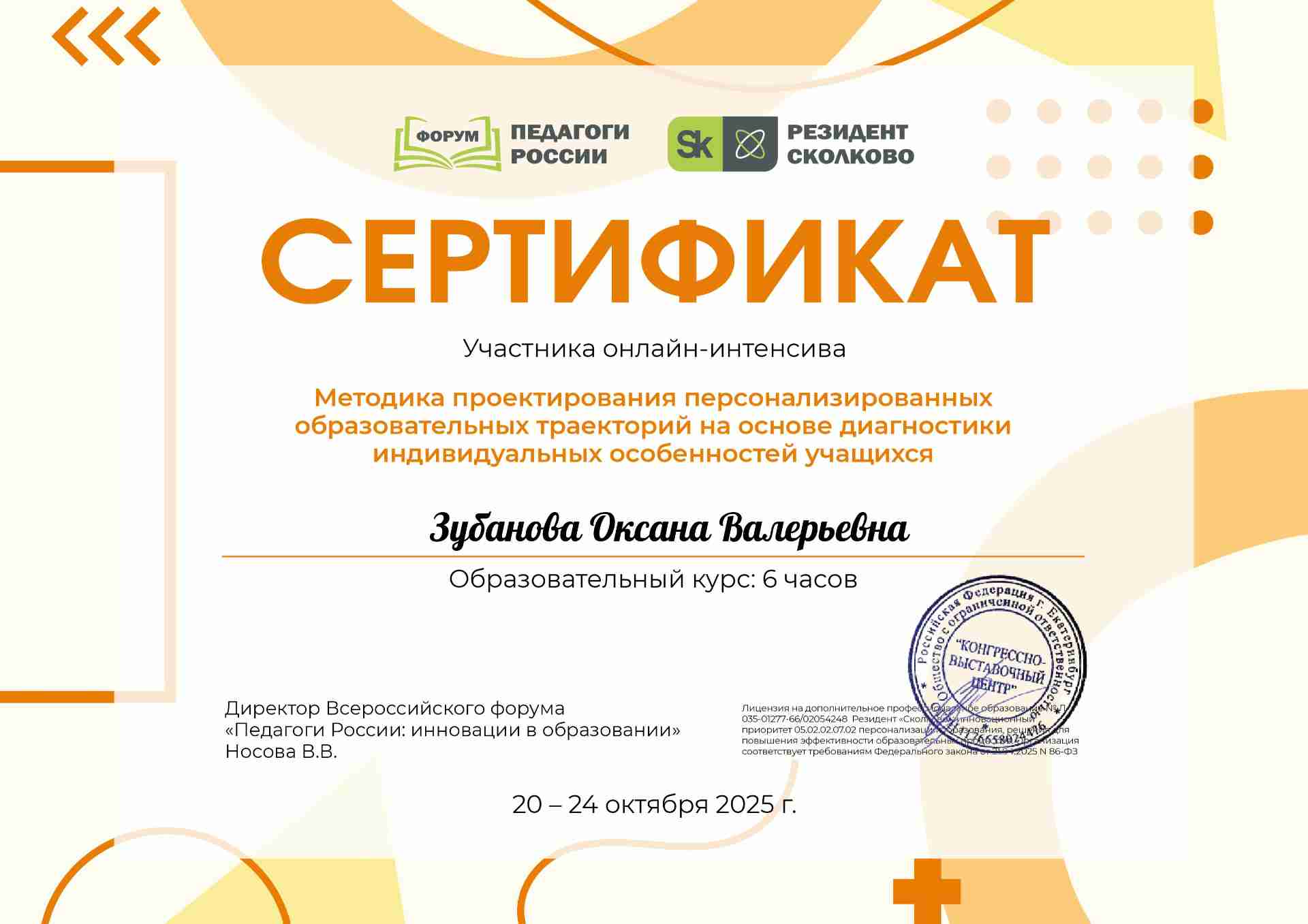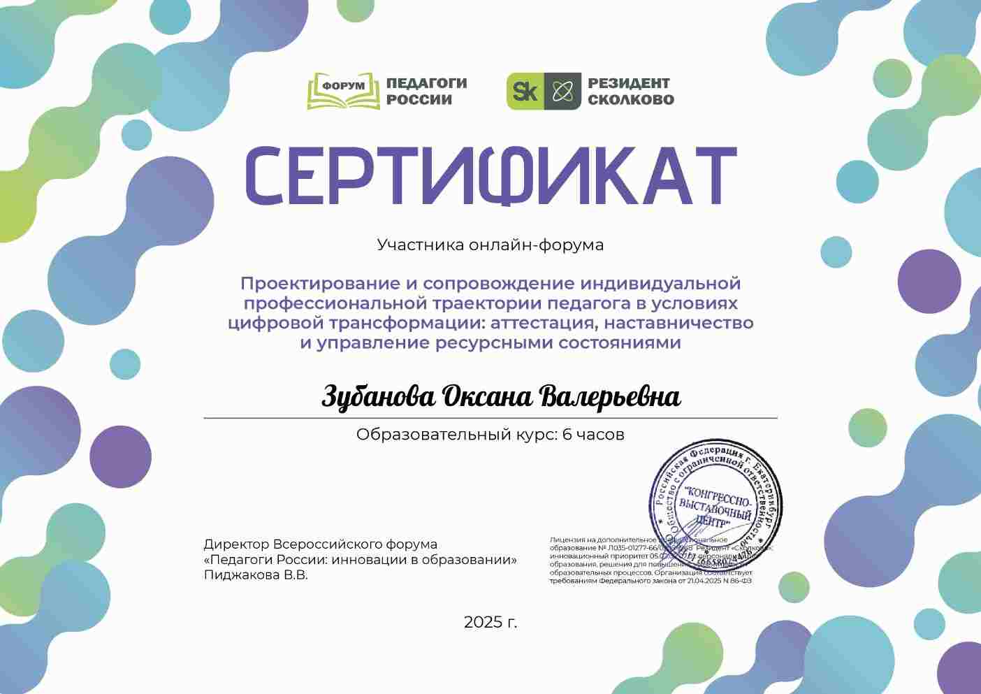 Сертификат участника онлайн-форума "Проектирование и сопровождение индивидуальной профессиональной траектории педагога в условиях цифровой трансформации: аттестация, наставничество и управление ресурсными состояниями"