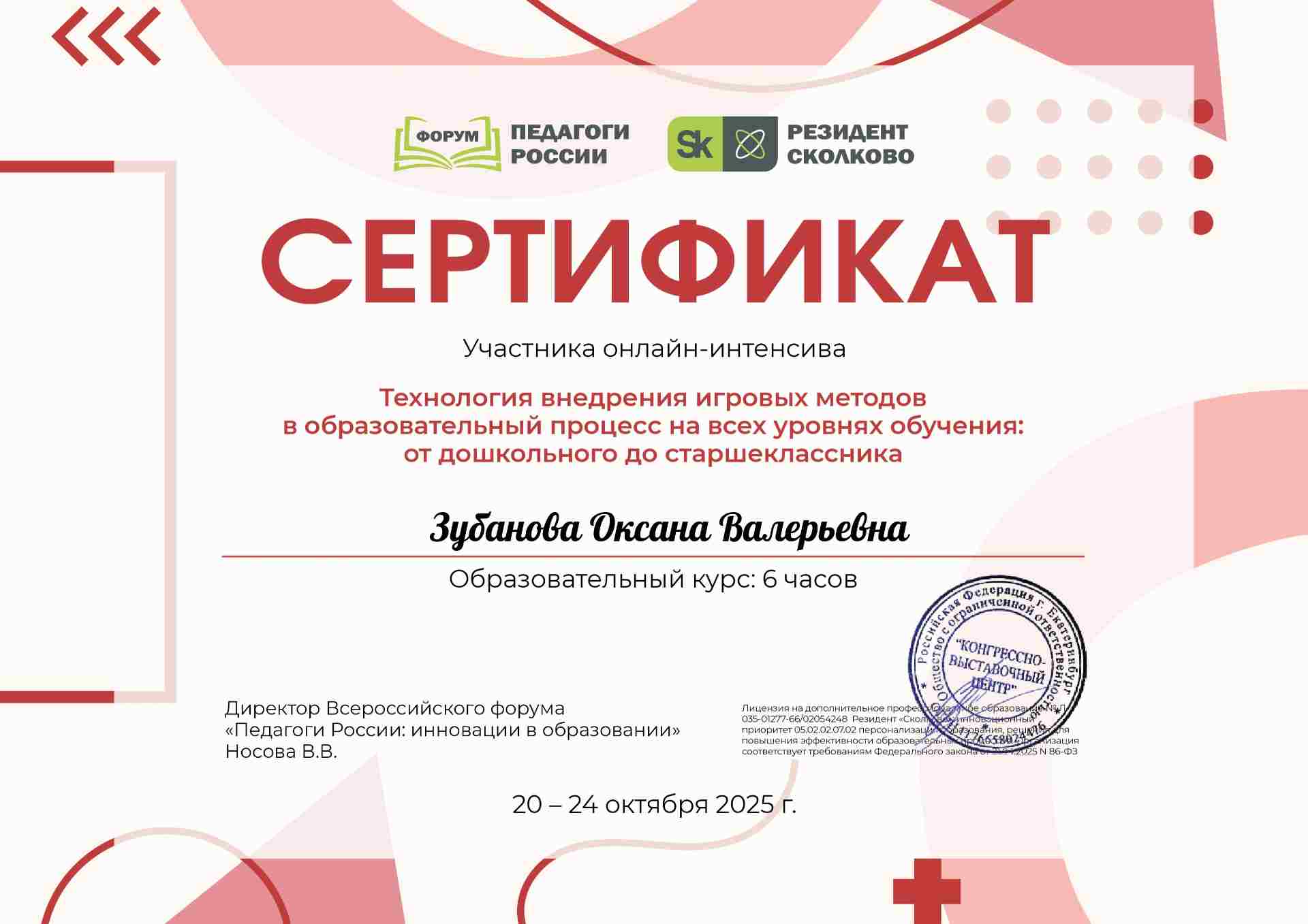 Сертификат участника онлайн-интенсива "Технология внедрения игровых методов в образовательный процесс на всех уровнях обучения: от дошкольника до старшеклассника