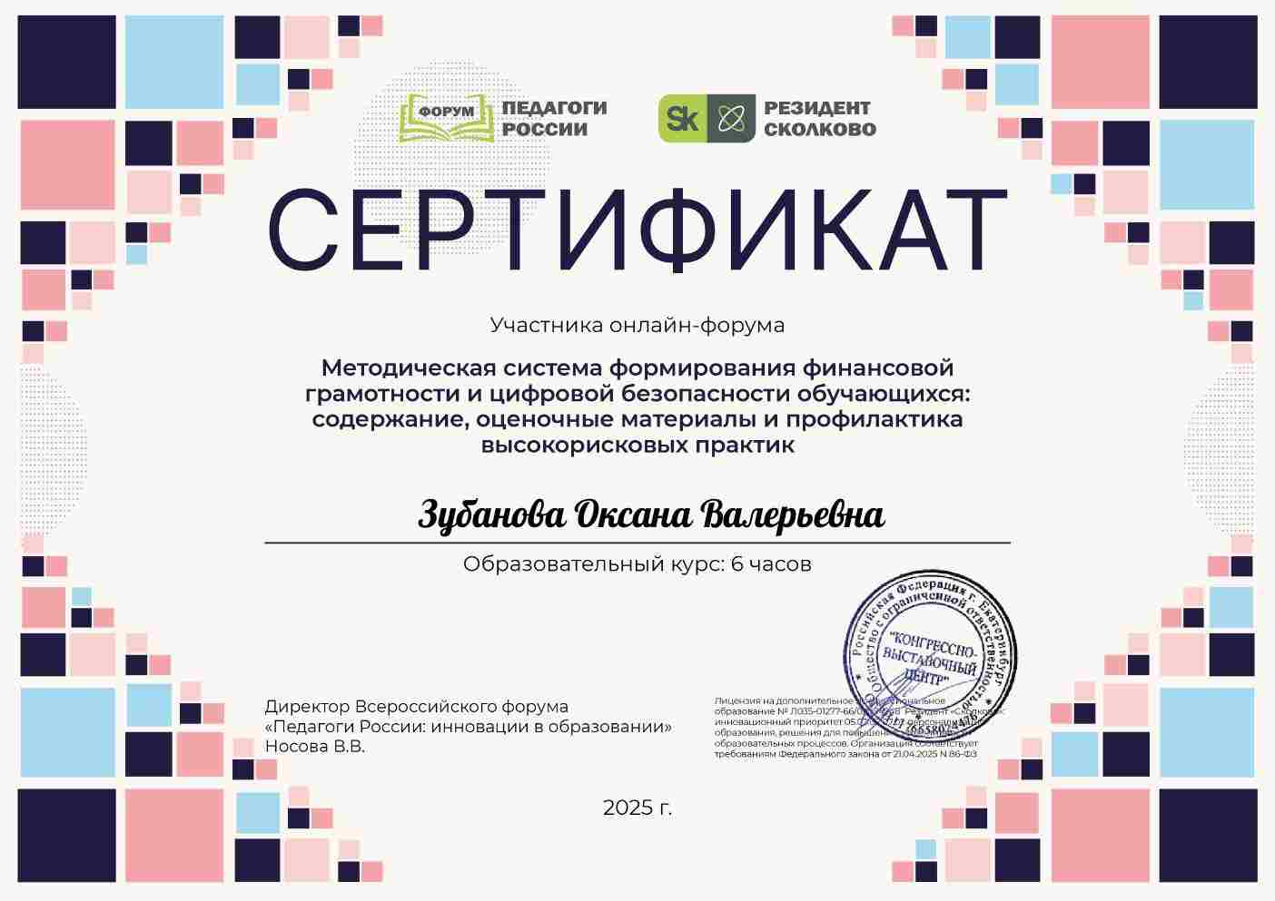 Сертификат участника онлайн-форума "Методическая система формирования финансовой грамотности и цифровой безопасности обучающихся: содержание, оценочные материалы и профилактика высокорисковых практик"