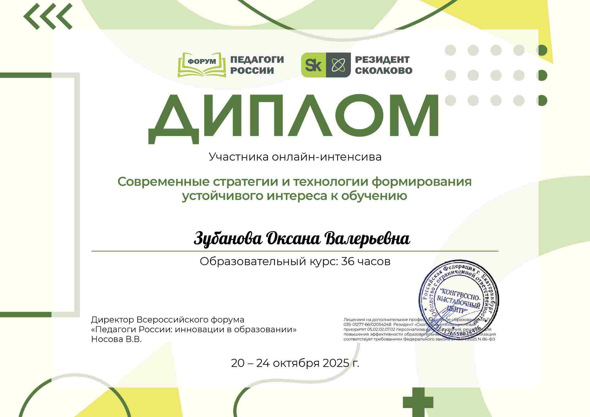 Диплом участника онлайн-интенсива "Современные стратегии и технологии формирования устойчивого интереса к обучению