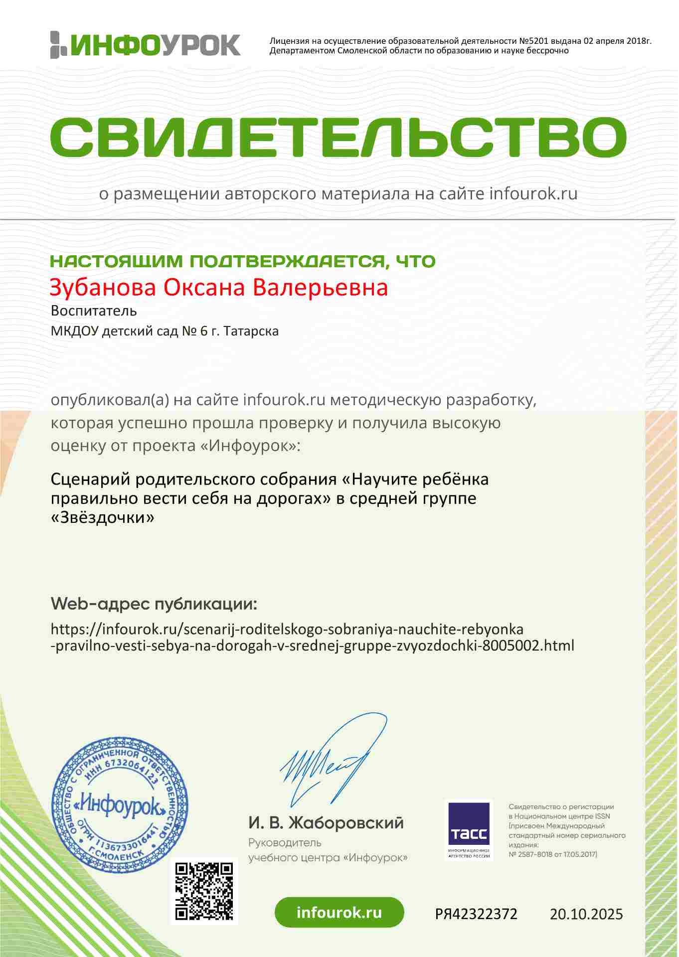 Свидетельство о публикации на сайте infourok.ru сценарий родительского собрания "Научите ребёнка правильно вести себя на дороге" в средней группе "Звёздочки"