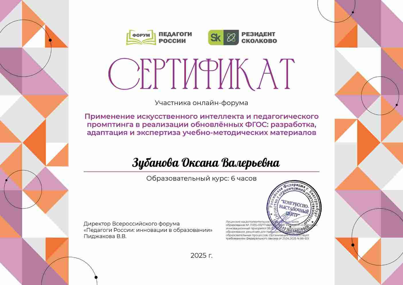 Сертификат участника онлайн-форума "Применение искусственного интеллекта и педагогического промптинга в реализации обновлённых ФГОС: разработка, адаптация и экспертиза учебно-методических материалов"