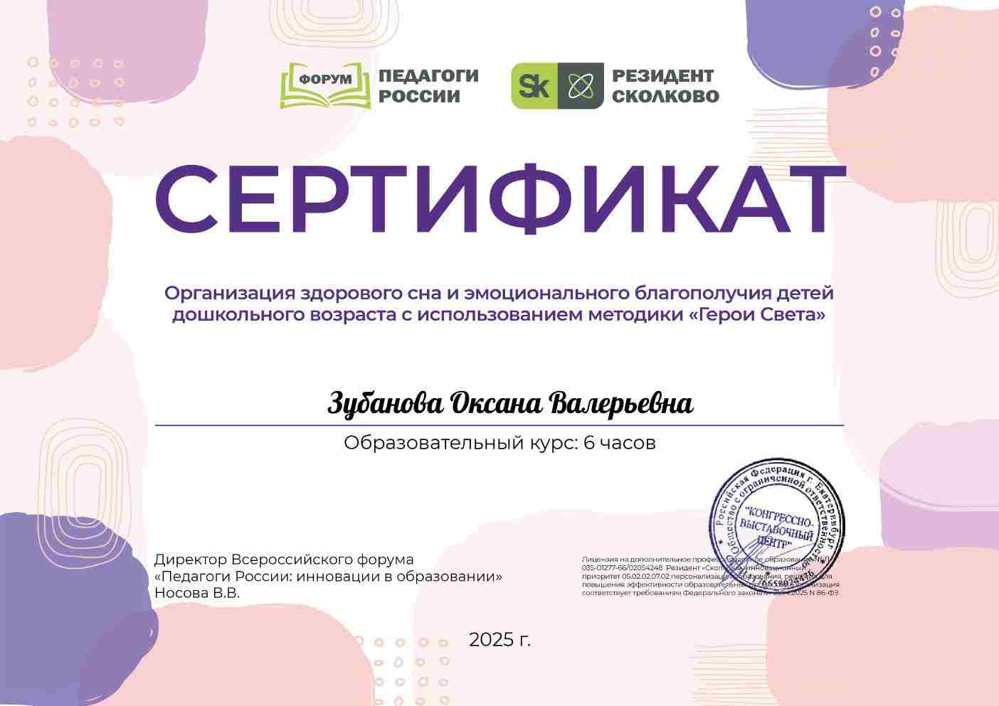 Сертификат "Организации здорового сна и эмоционального благополучия детей дошкольного возраста с использованием методики "Герои Света"