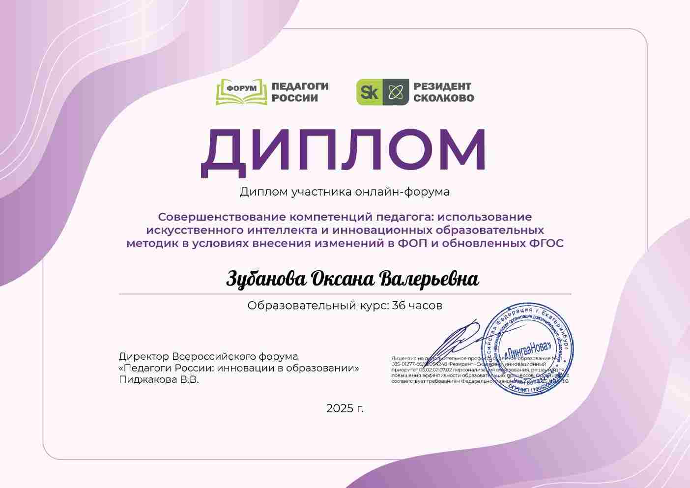 Диплом участника онлайн-форума "Совершенствование компетенций педагога: использование искусственного интеллекта и инновационных образовательных методик в условиях внесения изменений в ФОП и обновлённых ФГОС"