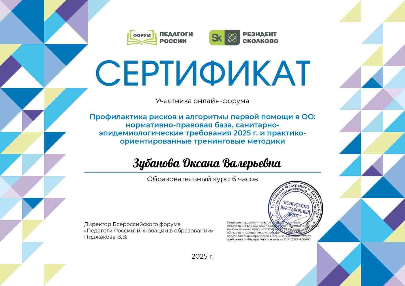 Сертификат участника онлайн-форума "Профилактика рисков и алгоритмы первой медицинской помощи в РО: нормативно-правовая база, санитарно-эпидемиологические требования 2025 г. и практико-ориентированные тренинговые методики'