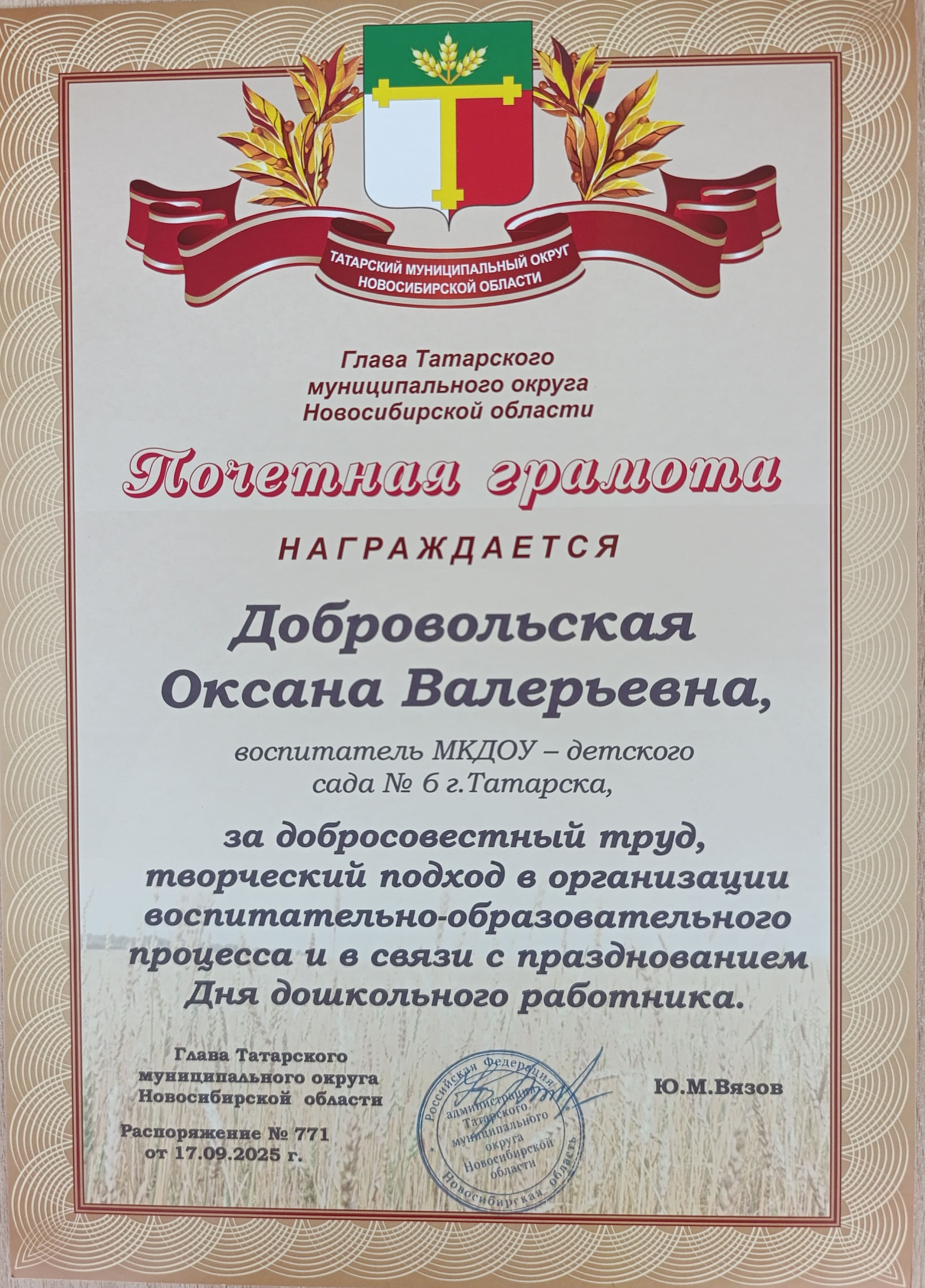Почетная грамота за добросовестный труд, творческий подход в организации воспитательно-образовательного процесса и в связи с празднованием Дня дошкольного работника.