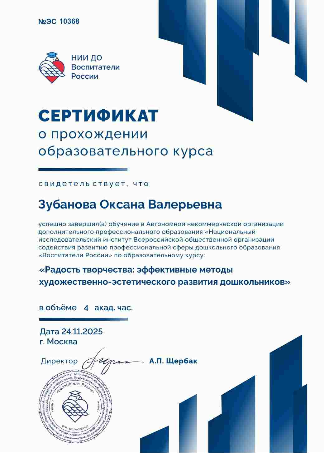 Воспитатели России сертификат о прохождении курса "Радость творчества: эффективные методы художественно-эстетического развития дошкольников"