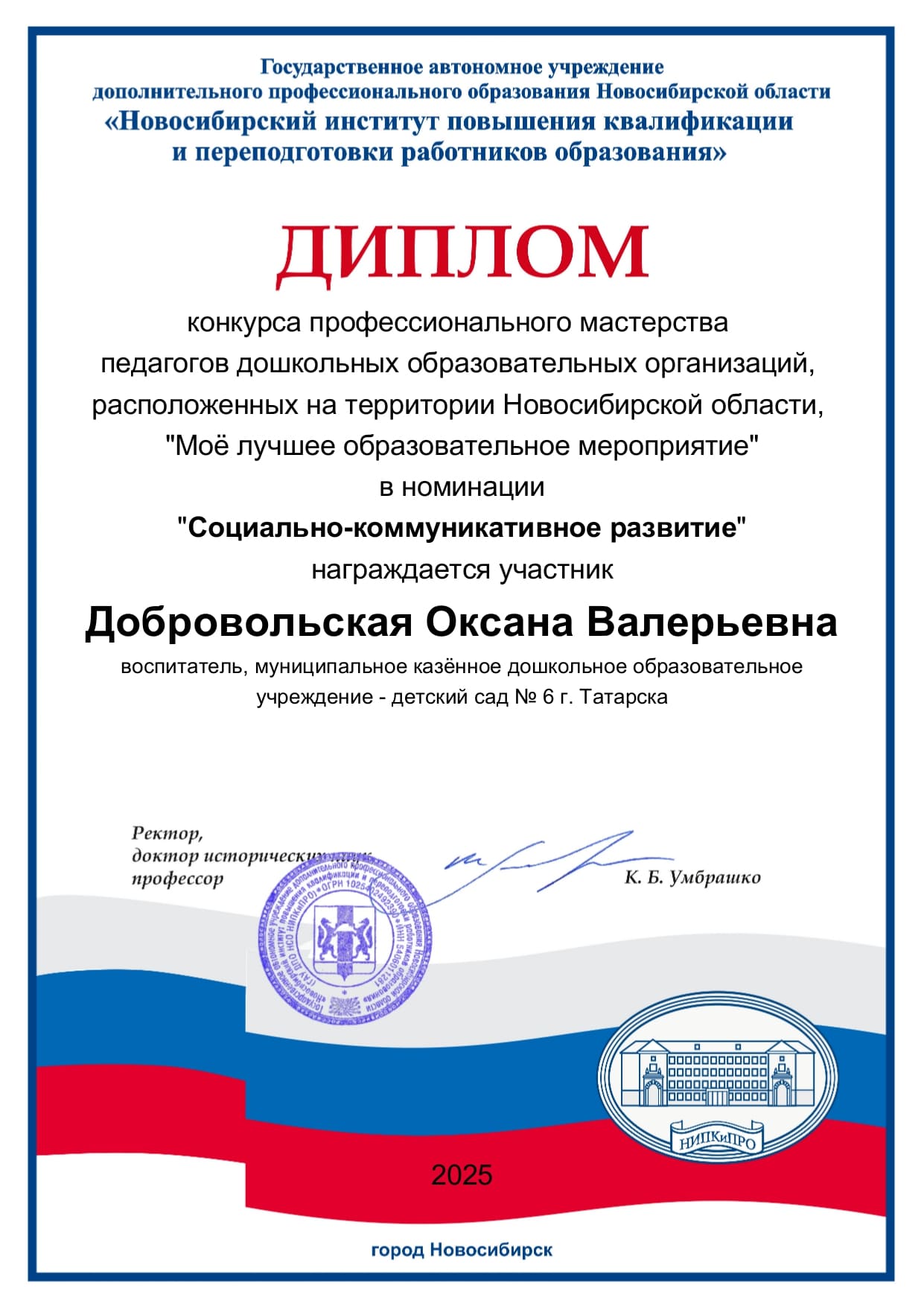 Диплом участника конкурса профессионального мастерства педагогов дошкольных образовательных организаций, расположенных на территории Новосибирской области, "Моё лучшее образовательное мероприятие"