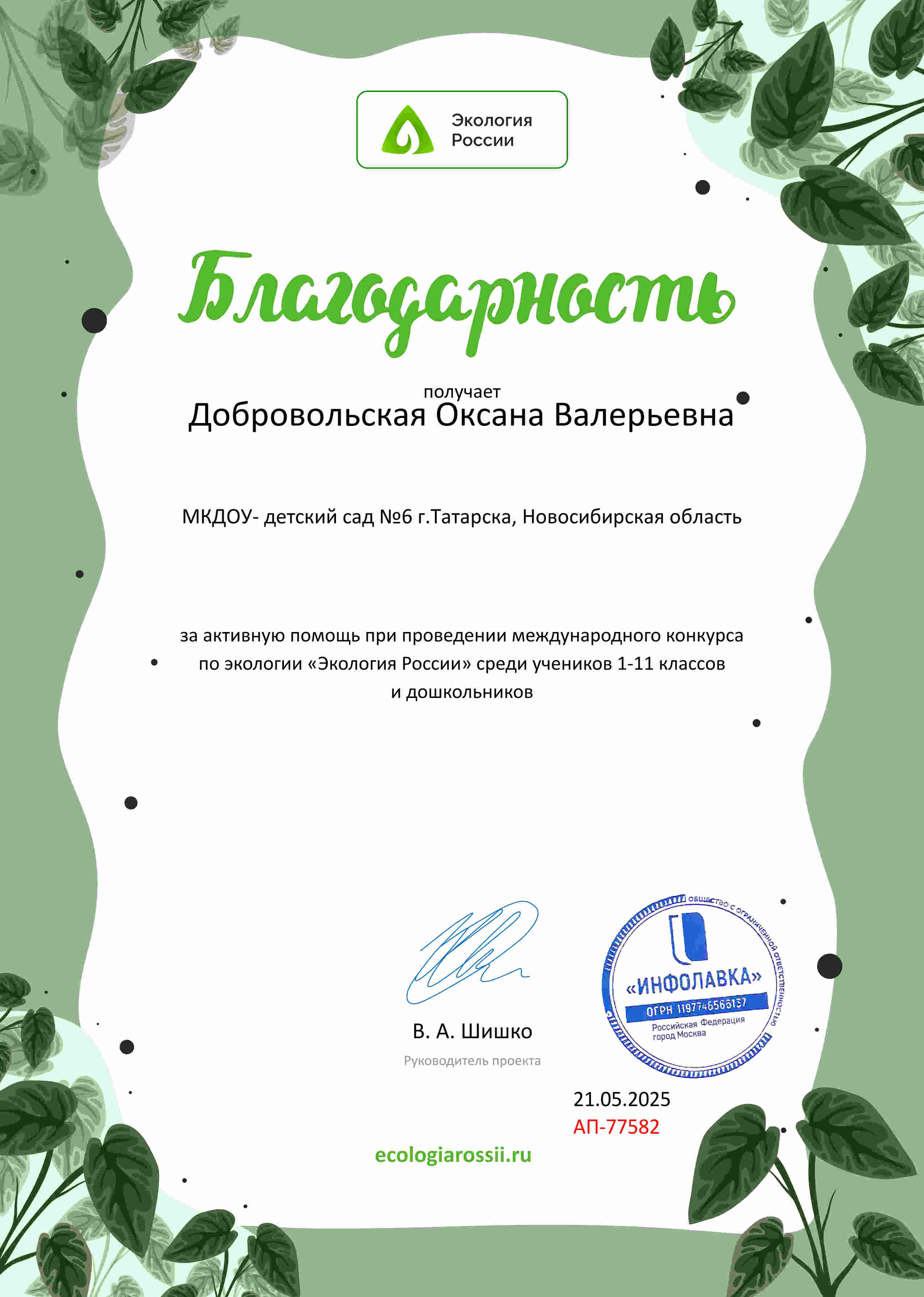 Благодарность за активную помощь при проведении международного конкурса по экологии "Экология России"