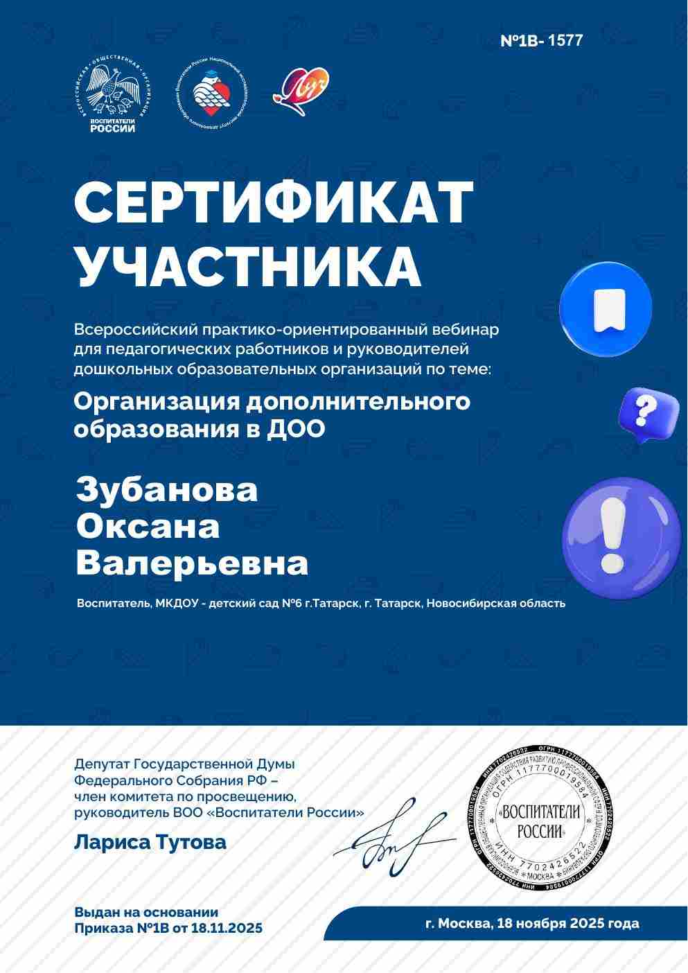 Всероссийский практико-ориентированный вебинар для педагогических работников и руководителей дошкольных образовательных организаций по теме : "Организация дополнительного образования в ДОО"