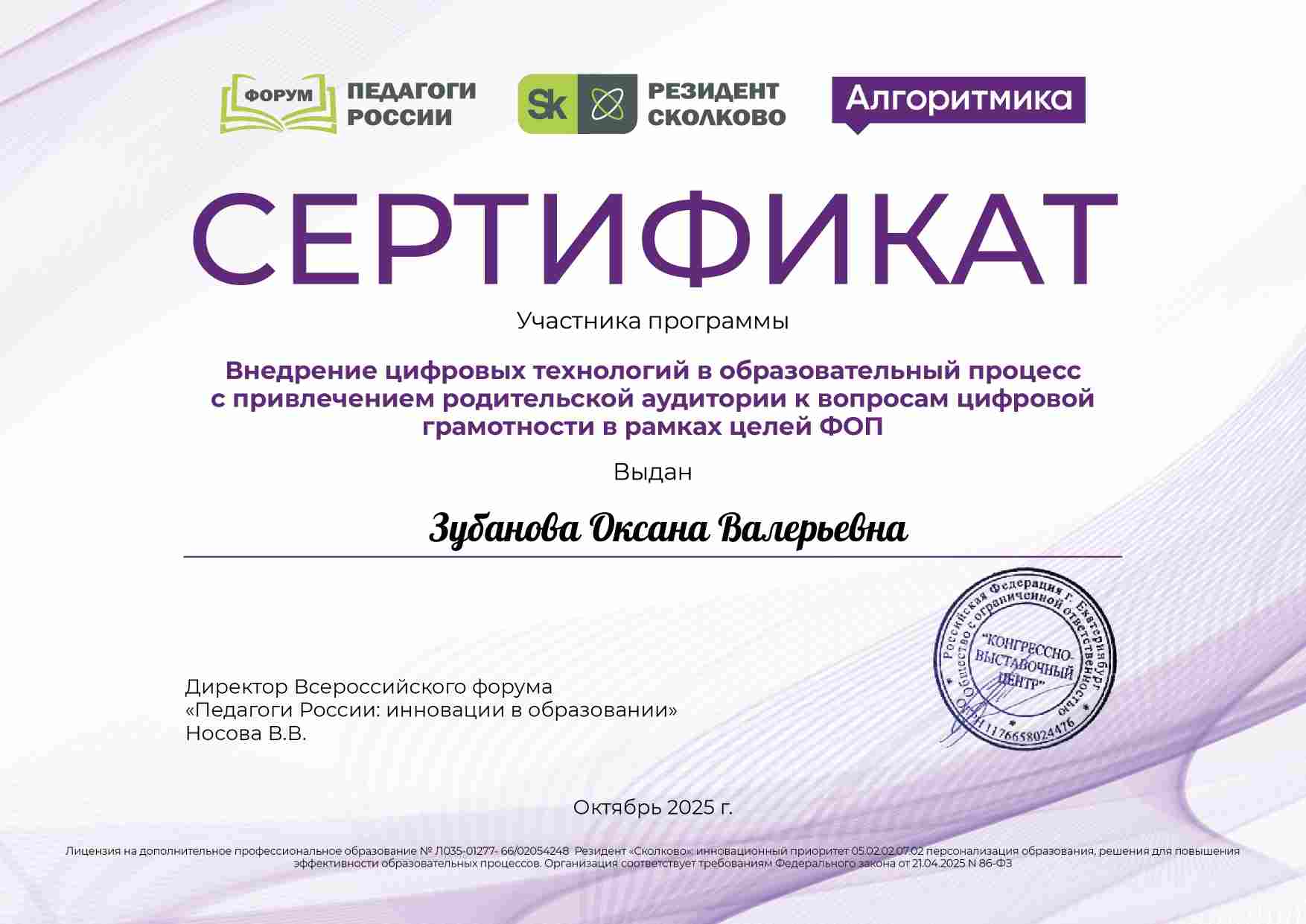 Сертификат всероссийского форума "Педагоги России", "Внедрение цифровых технологий в образовательный процесс с привлечением родительской аудитории к вопросам цифровой грамотности в рамках целей ФОП