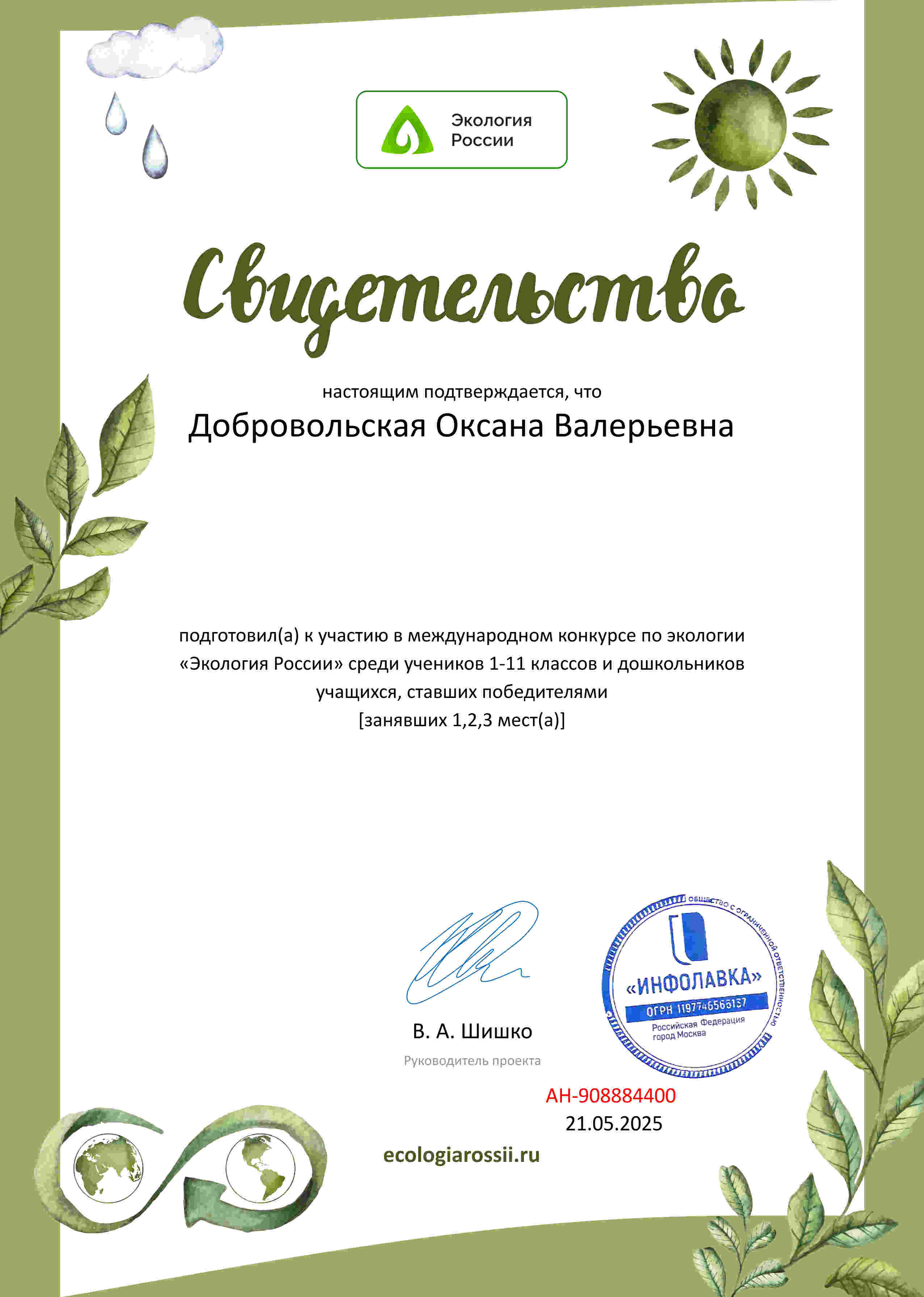 Свидетельство о подготовке к участию в международном конкурсе по экологии "Экология России"