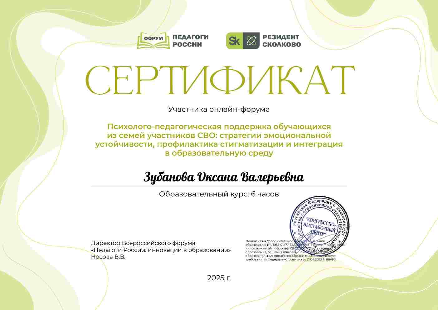 Сертификат участника онлайн-форума "Психолого-педагогическая поддержка обучающихся из семей участника СВО: стратегии эмоциональной устойчивости, профилактика стигматизации и интеграция в образовательную среду"